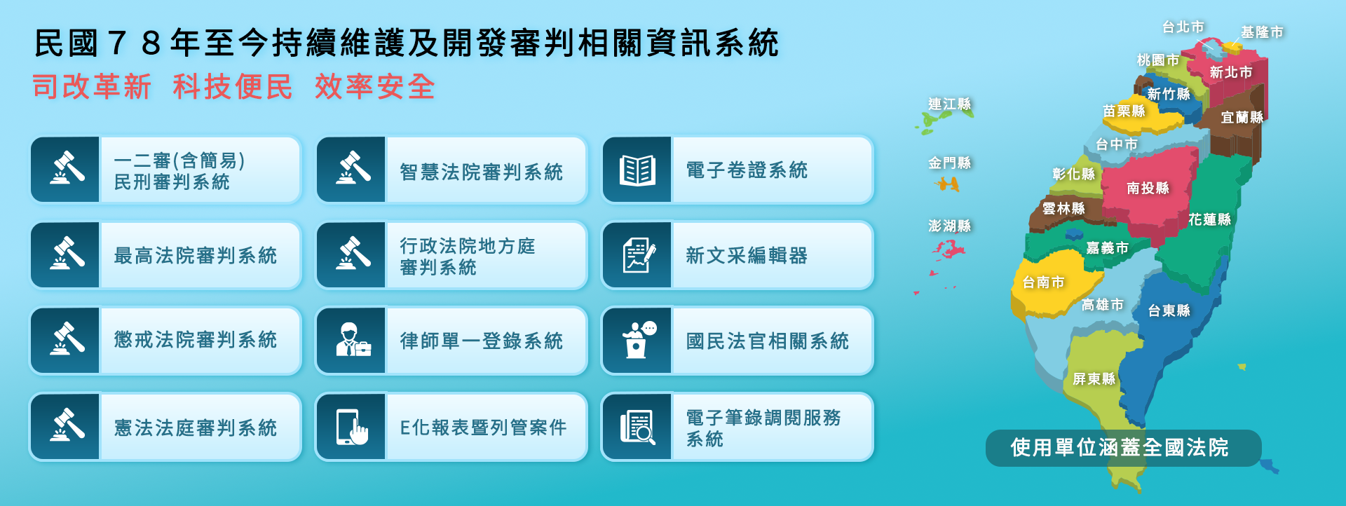 司法審判系統涵蓋司法審判體系相關系統之規劃開發、建置推廣及維護等。