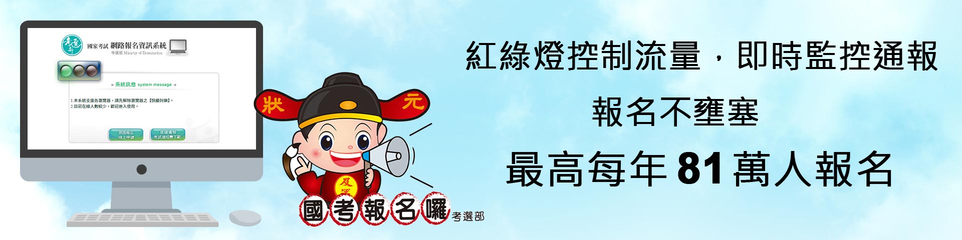 專為公務人員、專門職業及技術人員等應考而設立之網路報名系統,全年24小時服務不中斷,最高每年服務81萬餘名應考人報名。