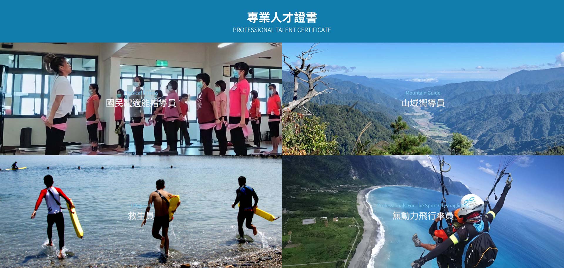 - 專業人才證書系統:各類證書報考資訊,如國民體適能指導員、山域嚮導、救生員、無動力飛行專業人員等專區。