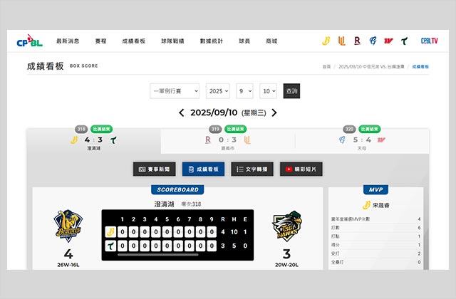 - 最新消息與賽事資訊:即時更新一軍與二軍的賽程、成績、球隊戰績與球員數據。