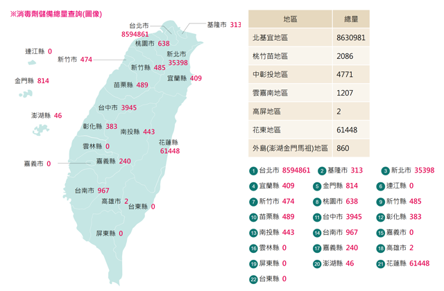 - 全國性物資數據查詢:可查詢全國物資總庫存、進貨與領用、安全儲備量、物資細項庫存及即將過期清單。