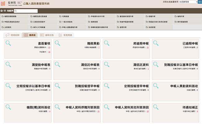 「公職人員財產申報管理系統」提供監察院公職人員財產申報處業務承辦人,進行申報人基本資料維護、申報資料收件、書面審核管理、公報校對製作、財產申報查核管理、檔案管理、罰鍰處分與行政爭訟管理、案件稽催管理,並提供主管運用相關資料統計數據。