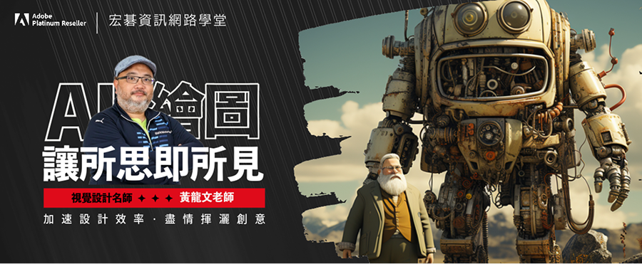 本次網路學堂邀請視覺設計系列名師—黃龍文老師,帶大家從Adobe Firefly文字生成圖片及Photoshop生成填色等功能面出發,一次瞭解多種AI繪圖工具特點,並搭配實地操作,示範如何將AI繪圖融入日常工作思考中,加速設計效率,盡情揮灑創意!