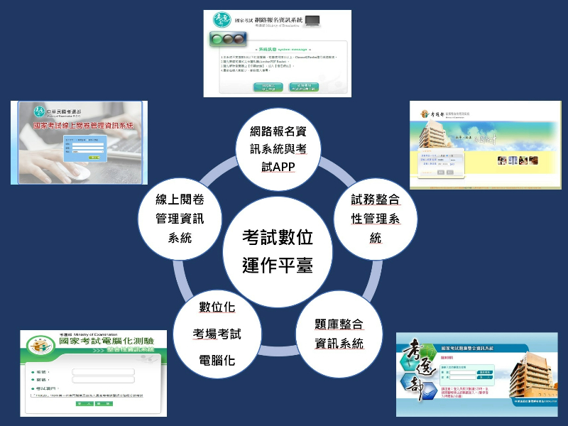 圖#1『國家考試數位運作平臺』其五大核心業務系統包含網路報名資訊系統、國家考試APP、試務整合性管理系統、題庫整合資訊系統、考試電腦化和線上閱卷管理資訊系統