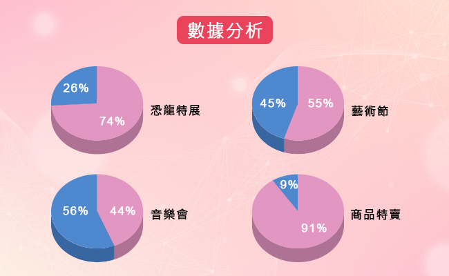 銷售排行、節目活動票房、受眾分析、售票通路、入場人數等圖象化數據分析,根據客戶需求開發問卷、整合行銷分析工具。