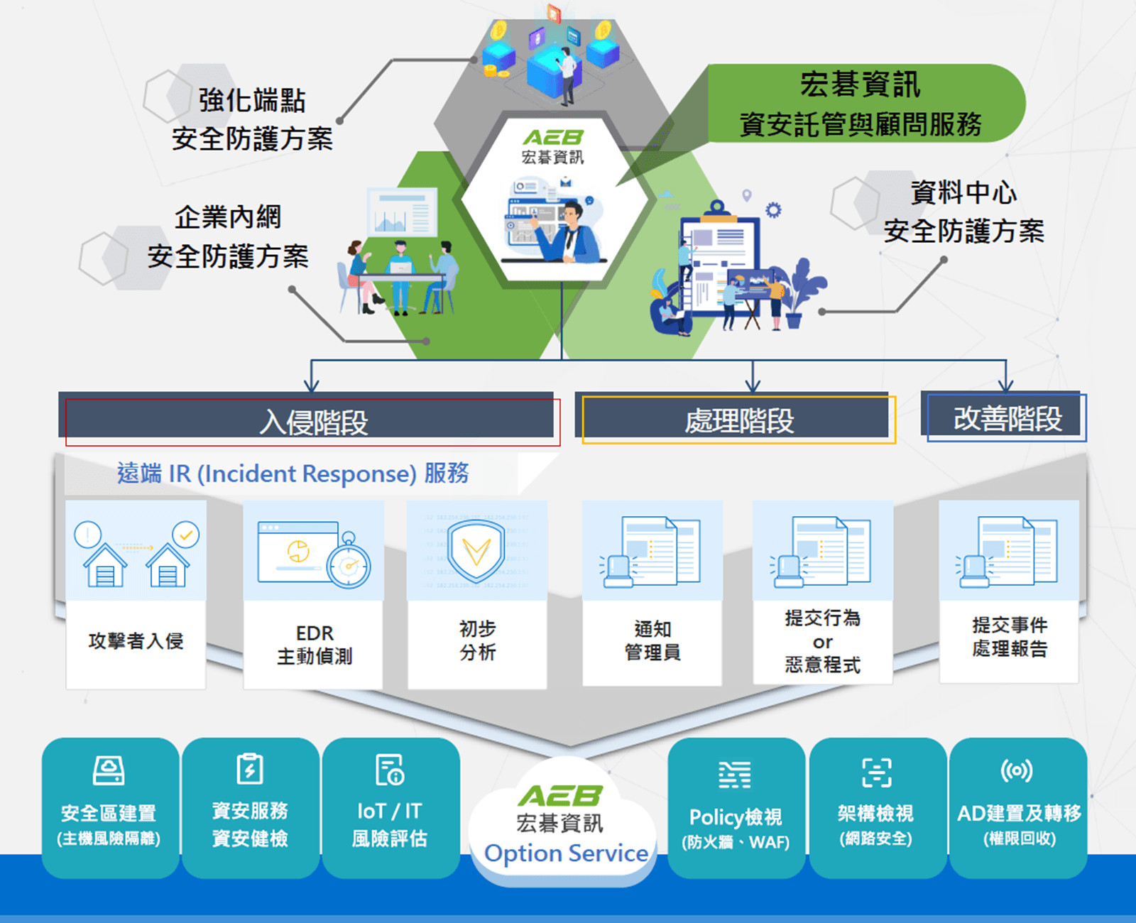 強化端點安全防護方案 : 針對員工電腦、行動裝置與作業平台,導入 EDR/XDR 等進階防護技術,結合威脅偵測與行為分析,主動識別可疑活動,防止惡意程式入侵與資料外洩。