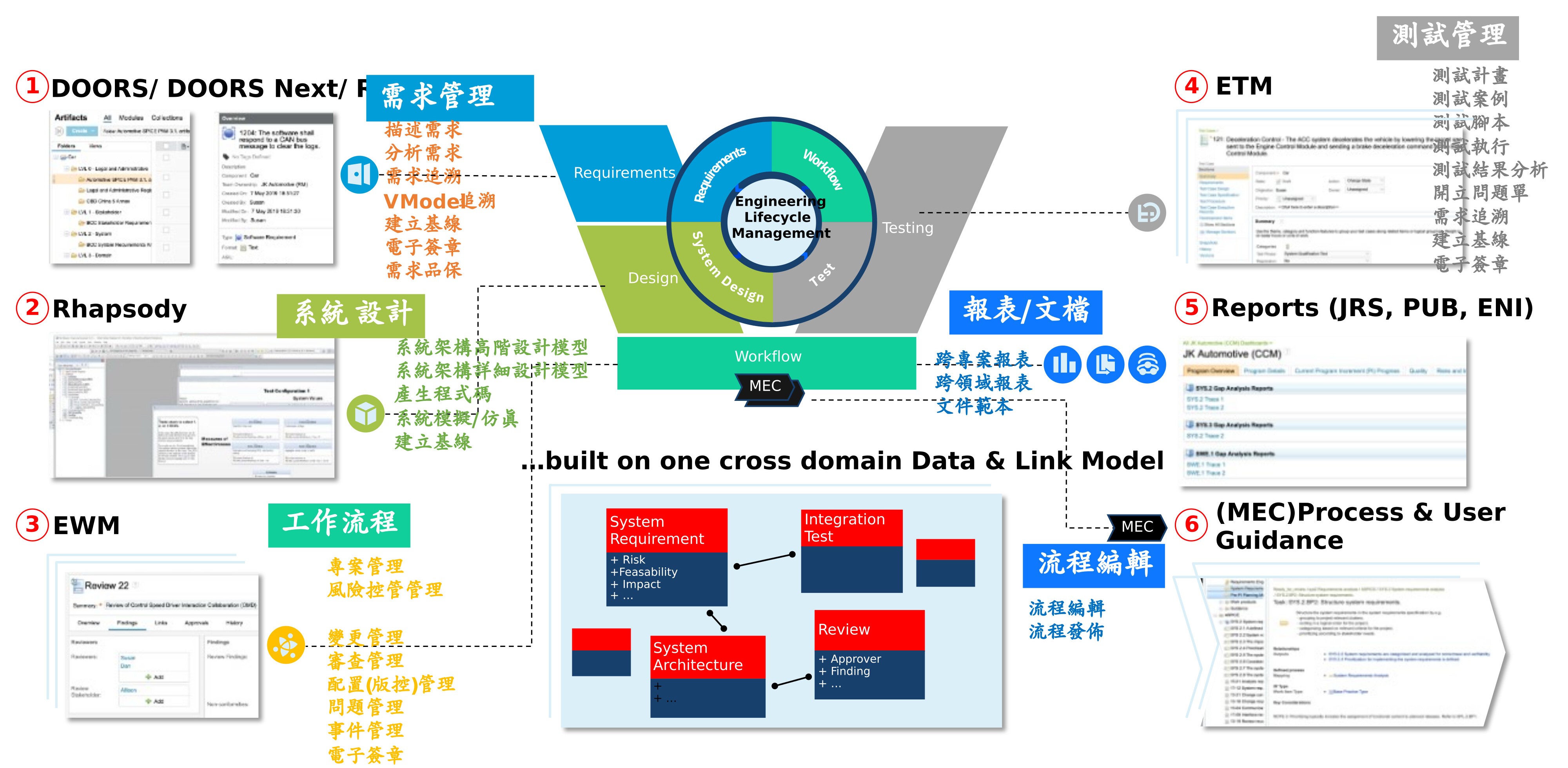 - 端對端可視化:覆蓋需求、系統設計、測試驗證至發佈的完整V-Model生命周期產出資訊。